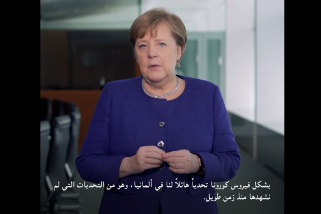 نشر الحساب الرسمي للحكومة الألمانية على فيسبوك أمس، خطابًا مصورًا للمستشارة أنجيلا ميركل، مترجمًا للغة العربية، تحدثت فيه ميركل عن التطورات الأخيرة لانتشار فيروس كورونا في البلاد، وجهود الدولة للحد من تفشي الوباء، وقالت المستشارة: “يشكل فيروس كورونا تحدياً كبيراً لألمانيا، لأنه يعتبر من التحديات التي لم نشهدها منذ زمن طويل، هذا الوباء اجتاح معظم بلاد العالم دون أن نجد له دواء، لذلك نحن نسميه اليوم بالجائحة”.