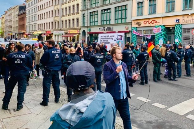 بالذهاب إلى أحد الشوارع الجانبية يمكنك رؤية أسطولًا من سيارات الشرطة مع حاجز بشري من أفراد الشرطة غير المرتدين لأي كمامات، وبالطبع مع عدم وجود تباعد بينهم، يقفون بجانب بعضهم البعض لمنع مرور المارة إلى حيث يقف مجموعة صغيرة من المتظاهرين، ولا يأبهون أيضًا لقواعد التباعد الاجتماعي مع سيارة تابعة لليسار! الآن يمكنني فهم عدم خروج المتظاهرين إلى الميدان، فقد أعلن القائمون على تنظيم التظاهرات في وقت سابق اعتمادهم أسلوب “الفراشة” في التظاهر، حيث الظهور والاختفاء في مجموعات صغيرة وفي الشوارع الجانبية وليس الشوارع الرئيسية، وقد يفسر هذا صعوبة حصر أعداد المتظاهرين حيث تحدثت الشرطة عن وجود 1000 متظاهر وتشير بعض التقارير الأخرى إلى أعداد أكبر! ويبقى عدد أفراد الشرطة (5000 عنصر) أكبر من أعداد متظاهري الأول من مايو هذا العام، في سابقة الأولى من نوعها في برلين.
