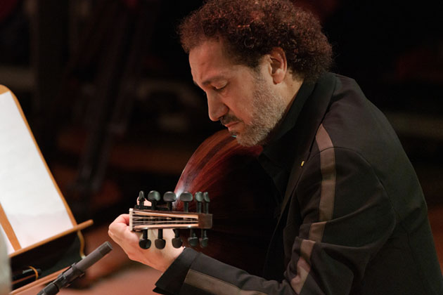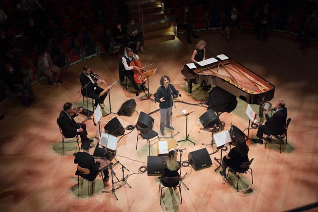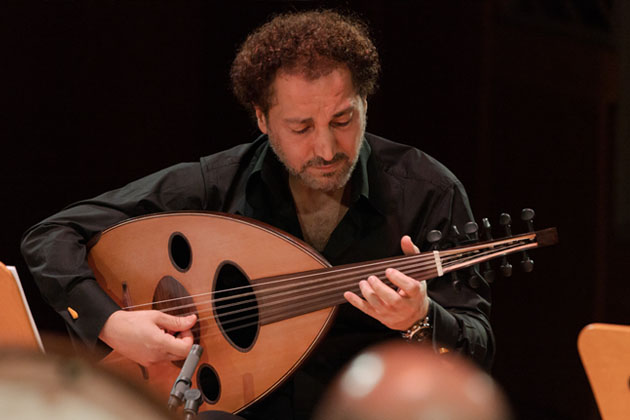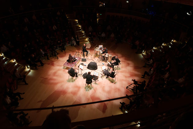 الصالة الموسيقية المستديرة في اليوم الأول، كان يلعوها مكبرات الصوت المزينة بأضواء متناثرة وموجهة على العازفين الذين قدموا من دول مختلفة (باكستان، تركيا، كردستان العراق، البرازيل، والعراق) لينقلوا عشقهم للموسيقى العربية التي تخطت الحدود بثرائها، وكانت سفيرًا راقيًا للثقافة العربية بفعالية حملت اسم (أسبوع الموسيقى العربية في برلين)