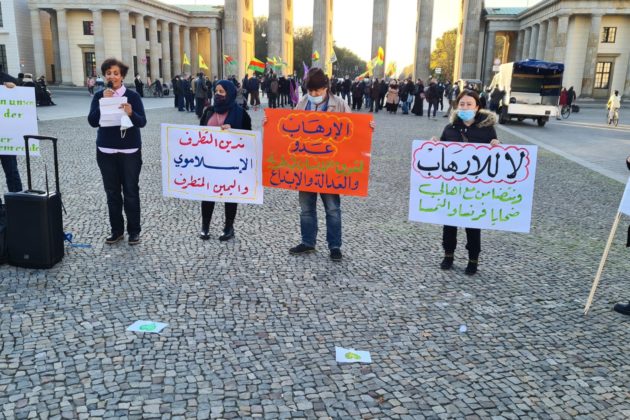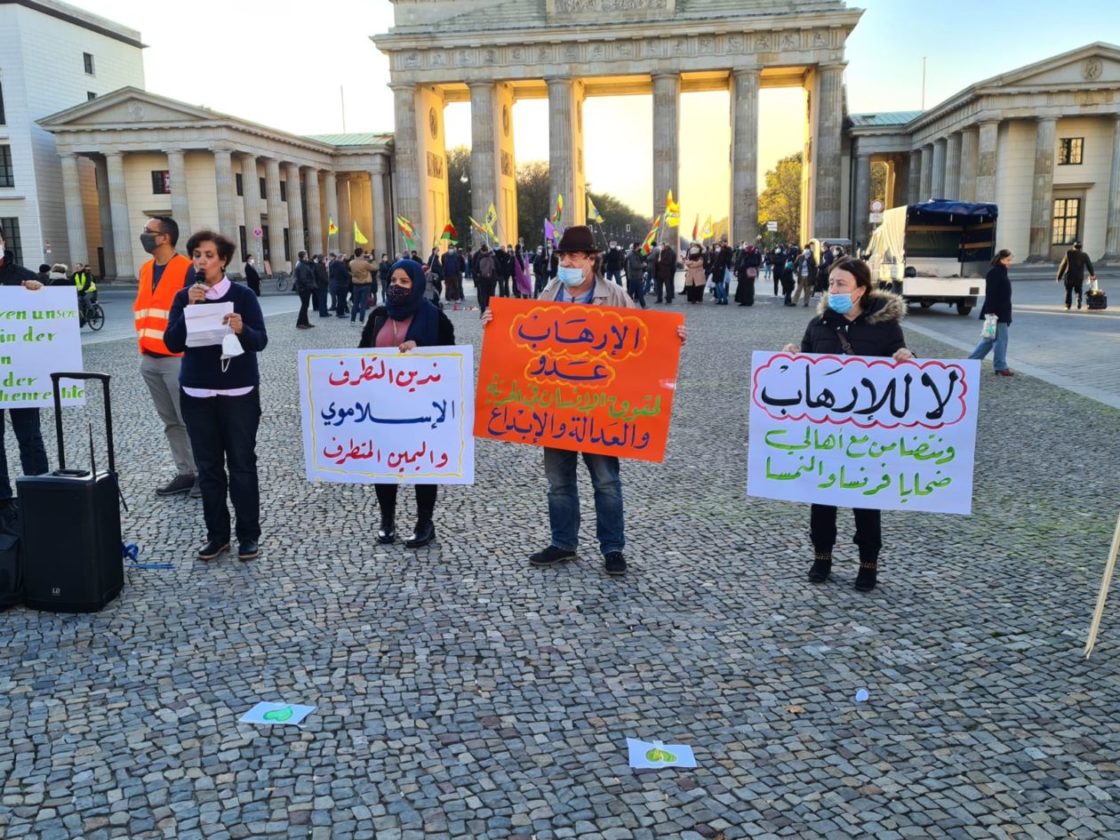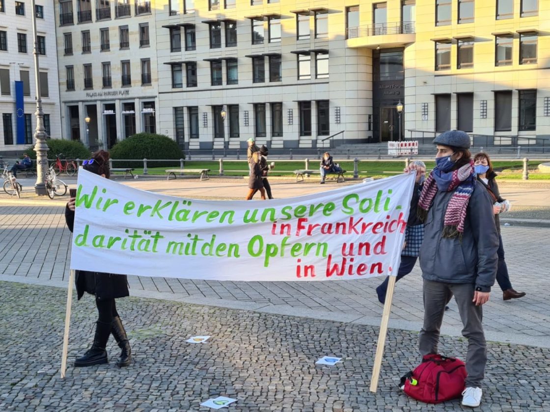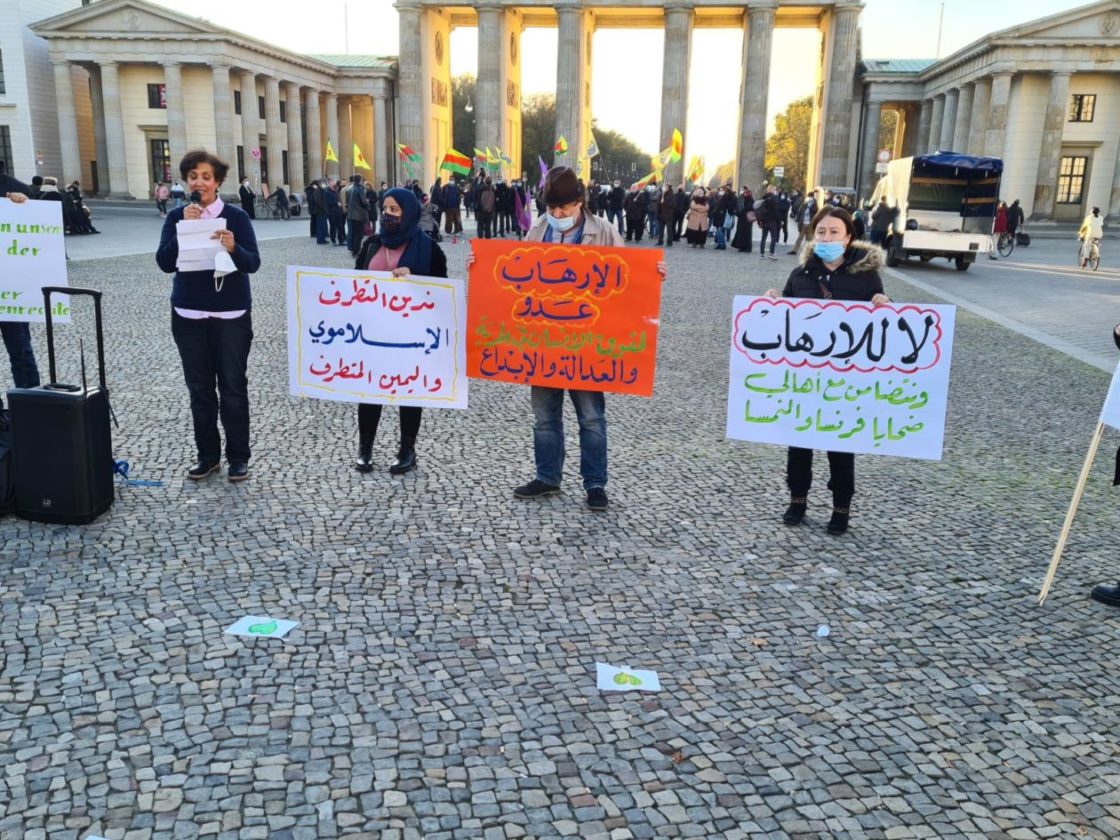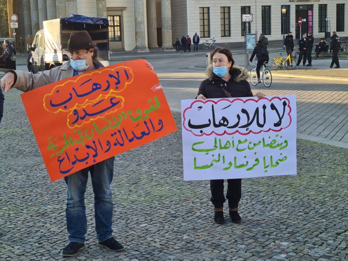 تجمع حوالي 25 شخصاً عند بوابة براندنبورغ في برلين، للتعبير عن تضامنهم مع ضحايا الإرهاب، خاصة العمليات الإرهابية الأخيرة، من مقتل المدرس الفرنسي في باريس، صموئيل باتي، إلى العملية الإرهابية التي حصلت في مدينة نيس الفرنسية، والعملية الإرهابية التي وقعت في العاصمة النمساوية فينا الإثنين الماضي! وقد ألقيت عدة كلمات باللغات العربية والإنكليزية والألمانية، تدين هذه العمليات وتعرب عن تضامنها مع أهالي الضحايا وتطالب السلطات المختصة بالعمل على اجتثاث منابع الإرهاب، كما أكدت الكلمات على أن الإرهاب يستهدف الجميع دون استثناء..
