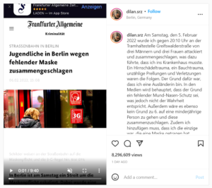 انتشر خبر الاعتداء على ابنة الـ 17 عاماً بمحطة الترام في برلين لعدم ارتداءها الكمامة كانتشار النار في الهشيم! وسائل الإعلام المحلية وغير المحلية الخبر تناقلت، في RBB وRND وSüddeutsche Zeitung وFrankfurter Allgemeine Zeitung وغيرها من الصحف. كان العنوان المسيطر للحادثة يفيد بعملية اعتداء على الفتاة بسبب الكمامة! ولكن ديلان سوزر، الضحية المعتدى عليها، خرجت عن صمتها بفيديو نشرته في حسابها الخاص على الإنستاغرام، تكشف فيه ملابسات وتفاصيل أُخفيت، واضعًة الشرطة والصحافة الألمانية بموقف حرج! فما هي القصة؟