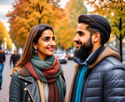 „Eine Frau und ein Mann in Berlin Sonnenallee. Der Mann kommt aus Syrien und ist frisch verliebt. Die Frau kommt aus Afghanistan und hat Probleme. Das Wetter ist bewölkt.“