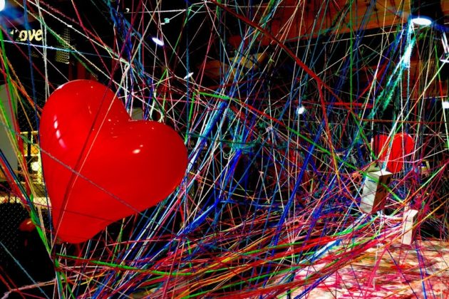 امروز تصمیم گرفتم بروم بیرون و شکل و شمایل ولنتاین را بر درودیوار شهر ببینم. در پیادهروی امروز، دنبال چیزهای خلاقتری میگردم که به روز عشاق تصویر دیگری میدهند. خوشبختانه پیدا میکنم. حتمن میپرسید «چی؟» جواب میدهم «یک اثر هنری درست وسط ساختمان بیکینیبرلین.» اثری ساخته شده از سادهترین و دمدستترین چیزها یعنی کامواهای رنگی و دو قلب سرخ. صاحب این اثر جورج است. او وسط مغازهی کوچک چوبی، یک میز گذاشته. بالای میز دو بادبادک قلبی از سقف آویزان است و اطراف قلبها یکعالمه کاموای رنگارنگ، شبکهای درست کرده است. مشتریها میتوانند به میل خودشان نخی به این شبکه ببافند و شکل آنرا تغییر دهند.