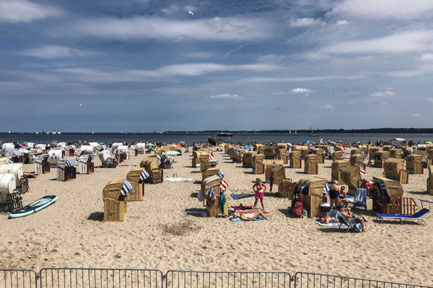 ۱۰ دقیقه بعد در ساحل دریای بالتیک بودیم. ساحل از امتداد چپ به راست پر از مسافر بود. کابینهایی با رنگهای زرد و آبی روشن در امتداد ساحل پراکنده شده بودند که بازدیدکنندگان میتوانستند در طول روز آنها را اجاره کنند.