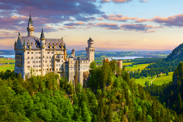 این قلعه (Schloss Neuschwanstein) در آلگوی بایرن قرار دارد و با چشم‌اندازی از جنگل، دریاچه و آسمان خودنمایی می‌کند. بازدیدکنندگان می‌توانند ۱۴ اتاق تاریخی قلعه را ببینند، از موزه و کافه آن لذت ببرند و در آشپزخانه قدیمی هم چرخی بزنند. (تصویر بالا)