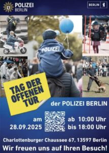 پلیس برلین در سال ۲۰۲۵ بار دیگر «روز درهای باز» را در منطقه رولبن (Ruhleben) برگزار میکند. این رویداد فرصتی برای شهروندان است تا از نزدیک با وظایف و بخشهای مختلف پلیس آشنا شوند و در عین حال یک روز خانوادگی پرنشاط را تجربه کنند.