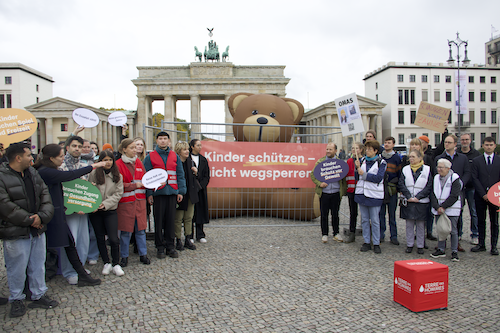 سازمانهای مدافع حقوق بشر از جمله Pro Asyl و Terre des Hommes، امروز در ساعت ۱۲:۳۰ در مقابل دروازه براندنبورگ تجمع کردند. معترضان با یک خرس عروسکی بزرگ در این مکان حاضر شدند و از نمایندگان پارلمان خواستند که حقوق کودکان و حقوق بشر را در اجرای اصلاحات رعایت کنند.