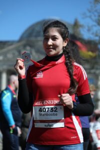 او میگوید دویدن را از افغانستان آغاز کرده بود، اما بهطور منظم از زمانی که فوتبال را شروع کرد در برلین ادامه داد، زیرا دویدن تأثیر مستقیم بر آمادگی بدنیاش دارد. ابتدا با تیمی آشنا شد که گاهی برای دویدن بیرون میرفتند و کمکم خودش به این ورزش علاقهمند شد. در برنامهای به نام «Frauen läuft» که مخصوص زنان است شرکت کرد و مسیر ده کیلومتری را دوید. پس از آن در سال ۲۰۲۵ هافماراتن (۲۱ کیلومتر) و سپس فولماراتن (۴۰ کیلومتر) را دوید که نخستین تجربه ماراتن کامل او بود. به گفته خودش: «دویدن حس خیلی خوبی دارد، چون با ذهن خودت شروع میکنی و با ذهن خودت تمام. دویدن روی استقامت بدن و ذهن تأثیر مستقیم دارد.»