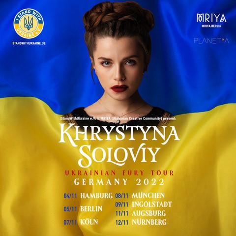 В листопаді з туром солідарності «Українська лють/Ukrainian Fury» в Німеччину приїде Христина Соловій. У програмі – хіти «Тримай», «Хто, як не ти?» та інші пісні, що увійшли до трьох альбомів співачки. Частину прибутку спрямують на медичну допомогу ЗСУ та у фонд IStandWithUkraine e.V. Виступ у Берліні – 05 листопада о 20:00 в UfaFabrik.