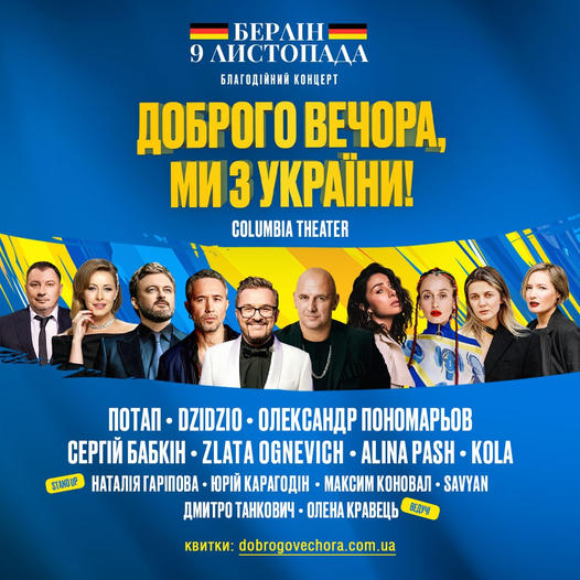 В рамках благодійного концерту «Доброго вечора, ми з України» в Берліні виступлять Потап, DZIDZIO, Олександр Пономарьов, Сергій Бабкін, Alina Pash, Kola. Також на сцену вийдуть комедійні актори Наталія Гаріпова, Максим Коновал, Юрій Карагодин, Savyan. Захід відбудеться 9 листопада о 18:00 в COLUMBIAHALLE. Посилання на квитки в коментарях.
