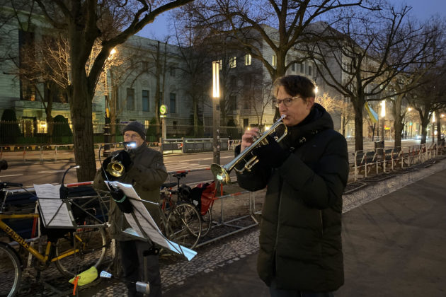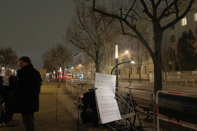 Після закінчення виступу музиканти дуже швидко розходяться у своїх справах. Навпроти російського посольства – лише лампадки біля фото жертв війни, яку Росія веде проти України уже майже дев’ять років. Вітер розвіває велетенський триколор над головним бульваром німецької столиці. Прапор майорить вище колісниці Бранденбурзьких воріт.