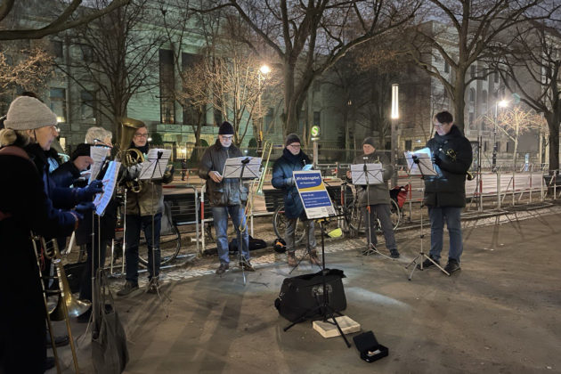 Темніє. Музиканти дістають свої труби, горни, тромбони та валторни. Температура -2С. Знімають рукавиці. Ініціатор акції Тобіас Ріхтштайг дуже зосереджений і суворо стежить за пунктуальністю. Концерт має розпочатися саме о 17:00 і рівно о 17:30 повинен зазвучати гімн України. По музиках справді можна звіряти годинник. Влітку, коли я працювала до 17 і йшла пішки повз Бранденбурзькі ворота додому, то завжди заставала останні акорди “Ще не вмерла України…”