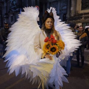 Жорну Бахусу 82. Майже рік щочетверга він приїздить до російського посольства: “Дощ чи сніг – не має значення. Я сідаю на велосипед і прямую сюди. За весь час може раз пропустив. Для мене це справжня молитва за свободу і мир. Ця війна страшна і несправедлива. Важливо хоч щось робити, щоб зупинити це страхіття”. Пан Бахус церковний горніст – уже багато років по неділях він фанфарами запрошує людей на месу. Така традиція подекуди збереглася в Німеччині з середньовіччя. Жорн каже, що гра на флюгель-горні позитивно впливає на здоров’я, як і добрі справи. Він вірить, що музика здатна робити чудеса!