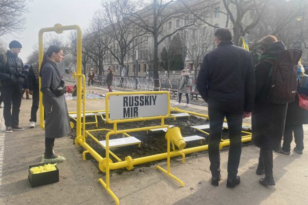 Навпроти посольства Росії на центральному бульварі Берліну встановили інсталяцію “Russkiy Mir”. Це газова труба яскраво-жовтого кольору, яка периметром відгороджує невеликий квадрат з вогкою чорною землею. Охочі можуть зайти всередину і відчути, як воно бути обмеженим правилами та законами «русского міра».