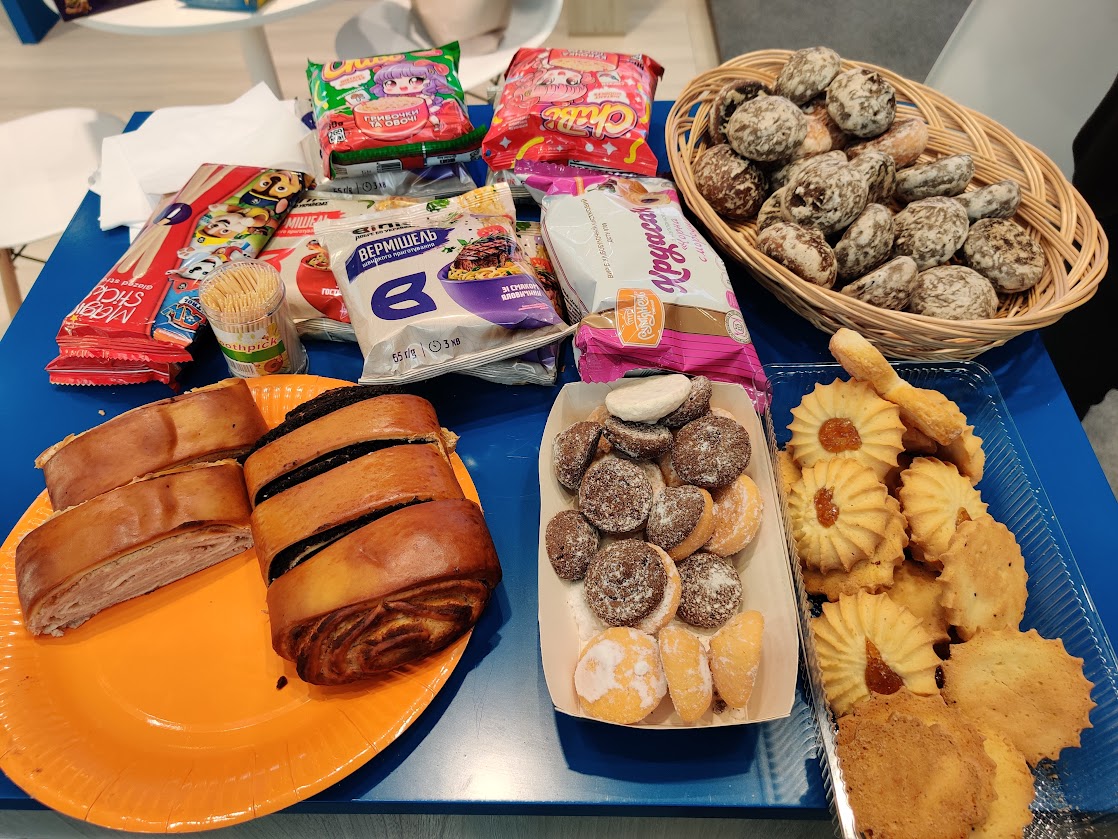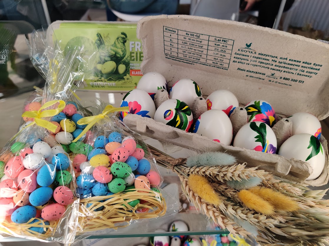 Кухня працює жваво, але страви розлітаються майже миттєво. На жаль, продавати привезену на виставку продукцію не будуть. У вітринах – українські яйця, цукерки, молоко, кефіри, йогурти та масло. Є борошно, пластівці, вермішель швидкого приготування. Печиво, пряники, рулети з маком, швидкі сніданки в упаковці можна скуштувати так само як і пиво, горілку та українське вино.