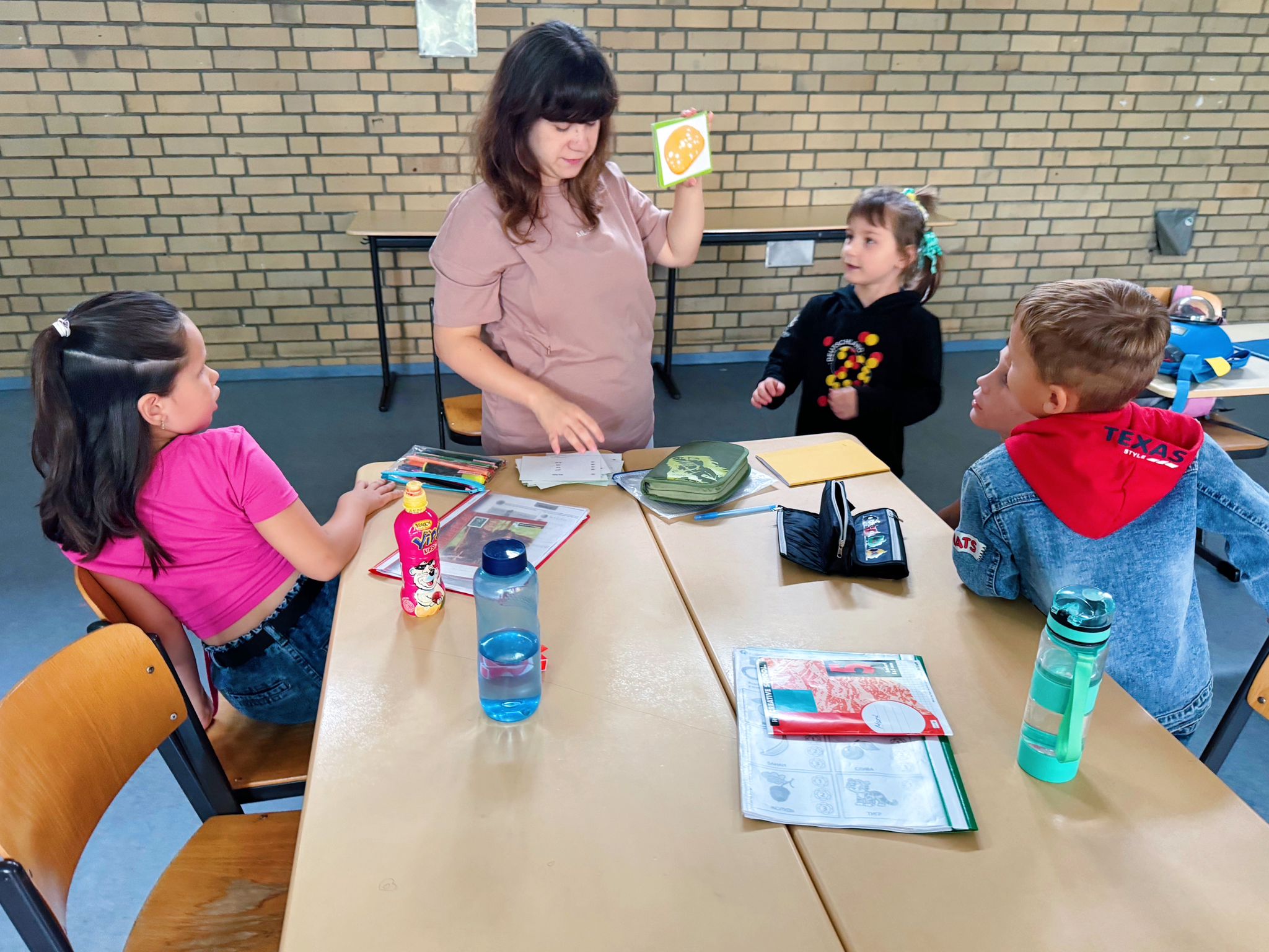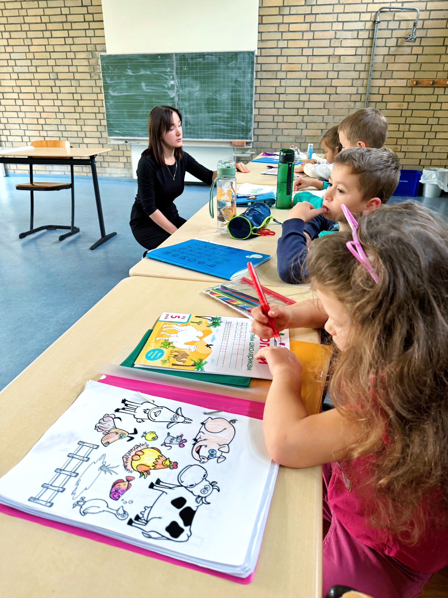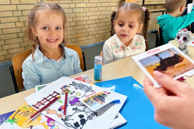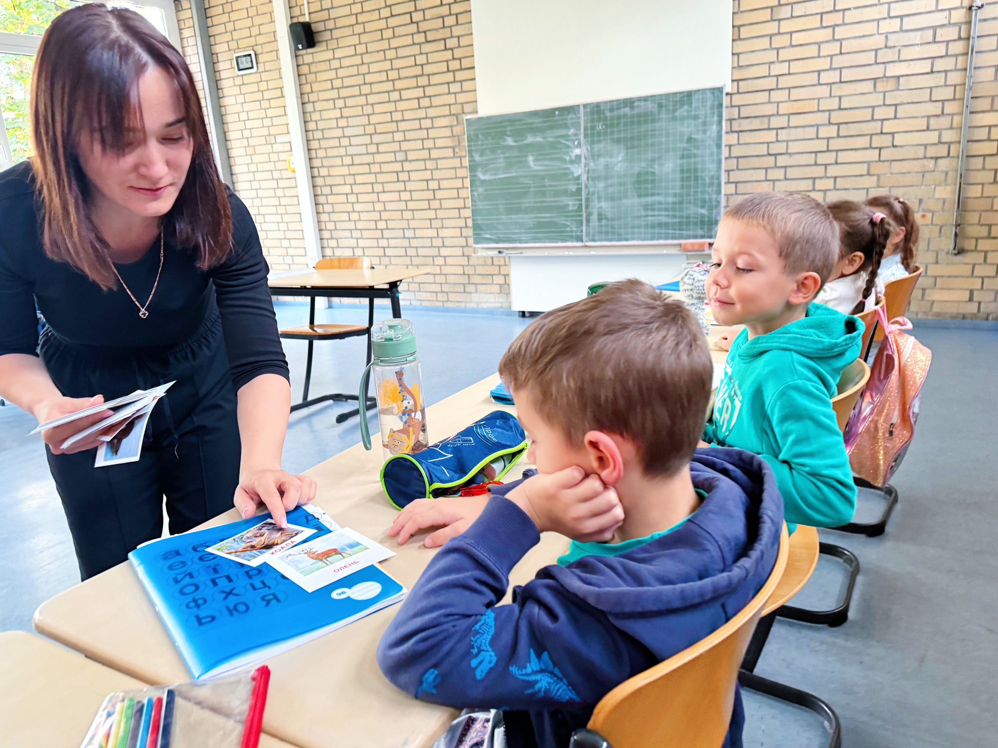 Урок української мови у першачків саме проводить киянка Богдана Бабенчук. За освітою вона вчителька початкових класів, працювала в Національній академії наук України. Каже, що бачить у дітей запал і бажання вчитися, навіть попри те, що не всі розуміють мову. “Діти дуже гарно переходять на українську і для них це не є складно, навіть попри те, що вдома вони спілкуються російською. Ми підібрали “Букварик-читайлик”, за яким працюють в українських школах. Прагнемо, щоб діти не відривалися від рекомендацій МОН України, просимо дивитися вдома мультфільми, читати більше – щоб мова була в активному вжитку”.