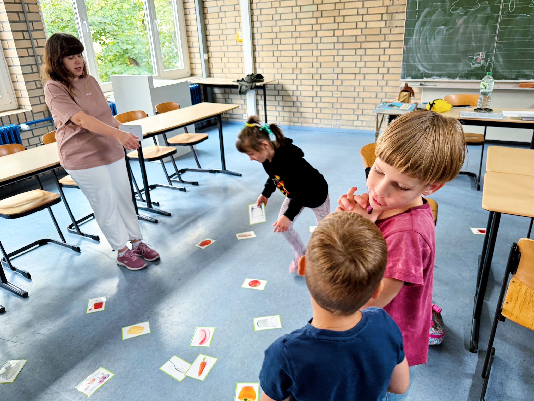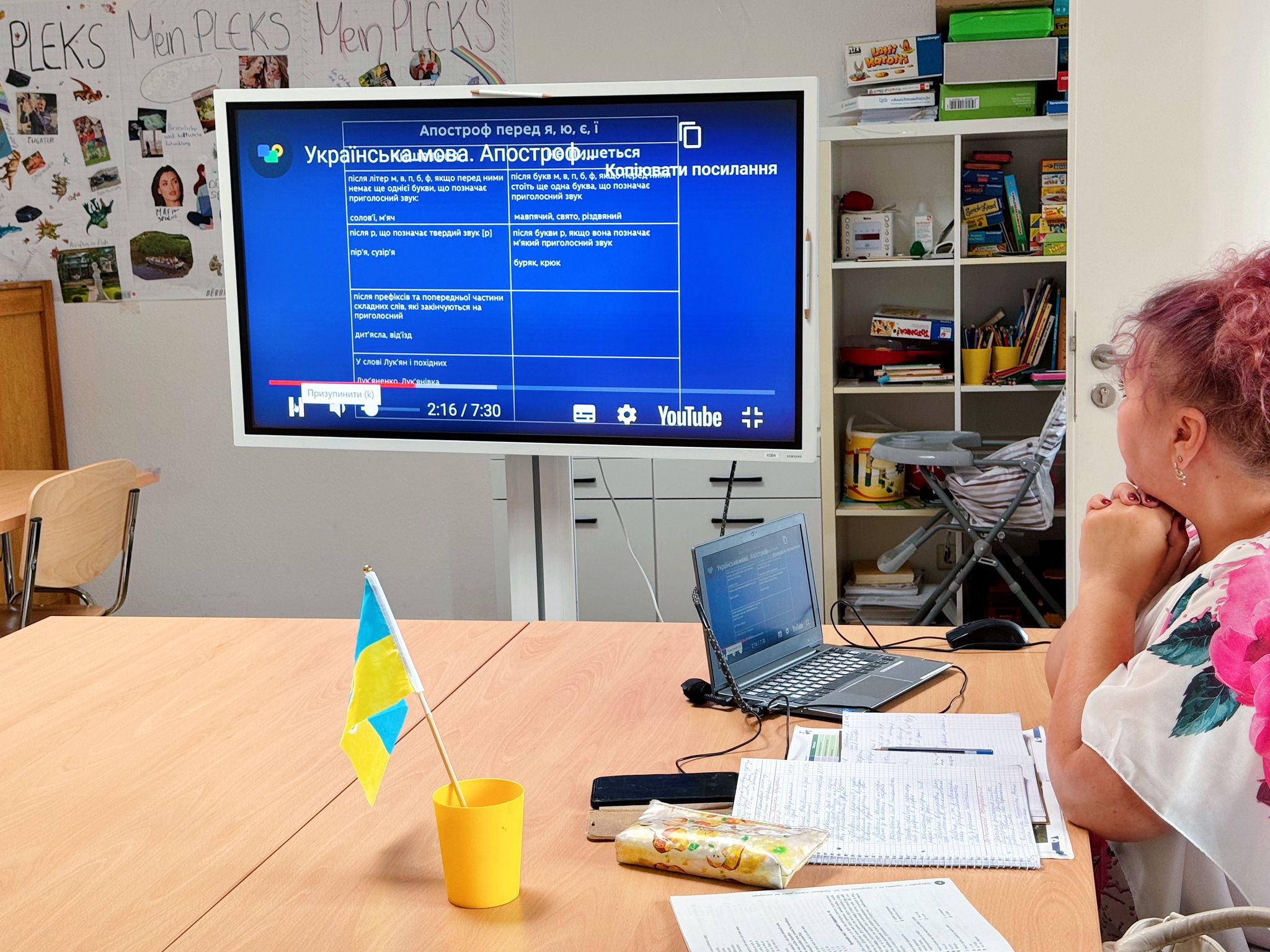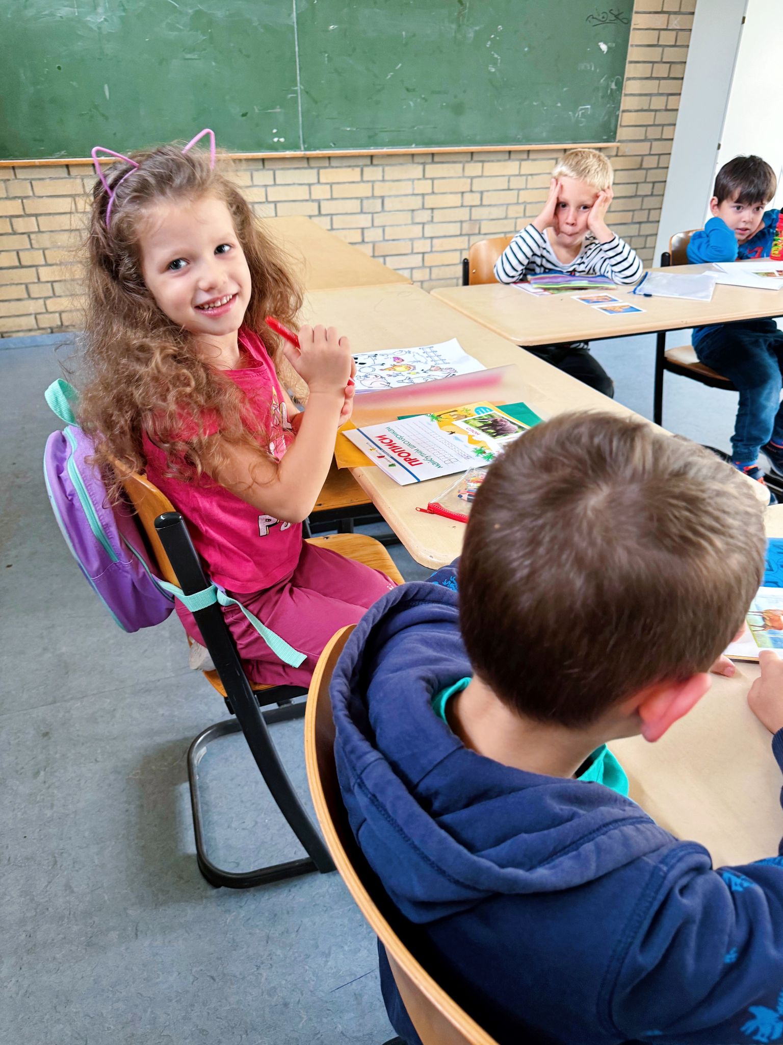 Урок української мови у першачків саме проводить киянка Богдана Бабенчук. За освітою вона вчителька початкових класів, працювала в Національній академії наук України. Каже, що бачить у дітей запал і бажання вчитися, навіть попри те, що не всі розуміють мову. “Діти дуже гарно переходять на українську і для них це не є складно, навіть попри те, що вдома вони спілкуються російською. Ми підібрали “Букварик-читайлик”, за яким працюють в українських школах. Прагнемо, щоб діти не відривалися від рекомендацій МОН України, просимо дивитися вдома мультфільми, читати більше – щоб мова була в активному вжитку”.