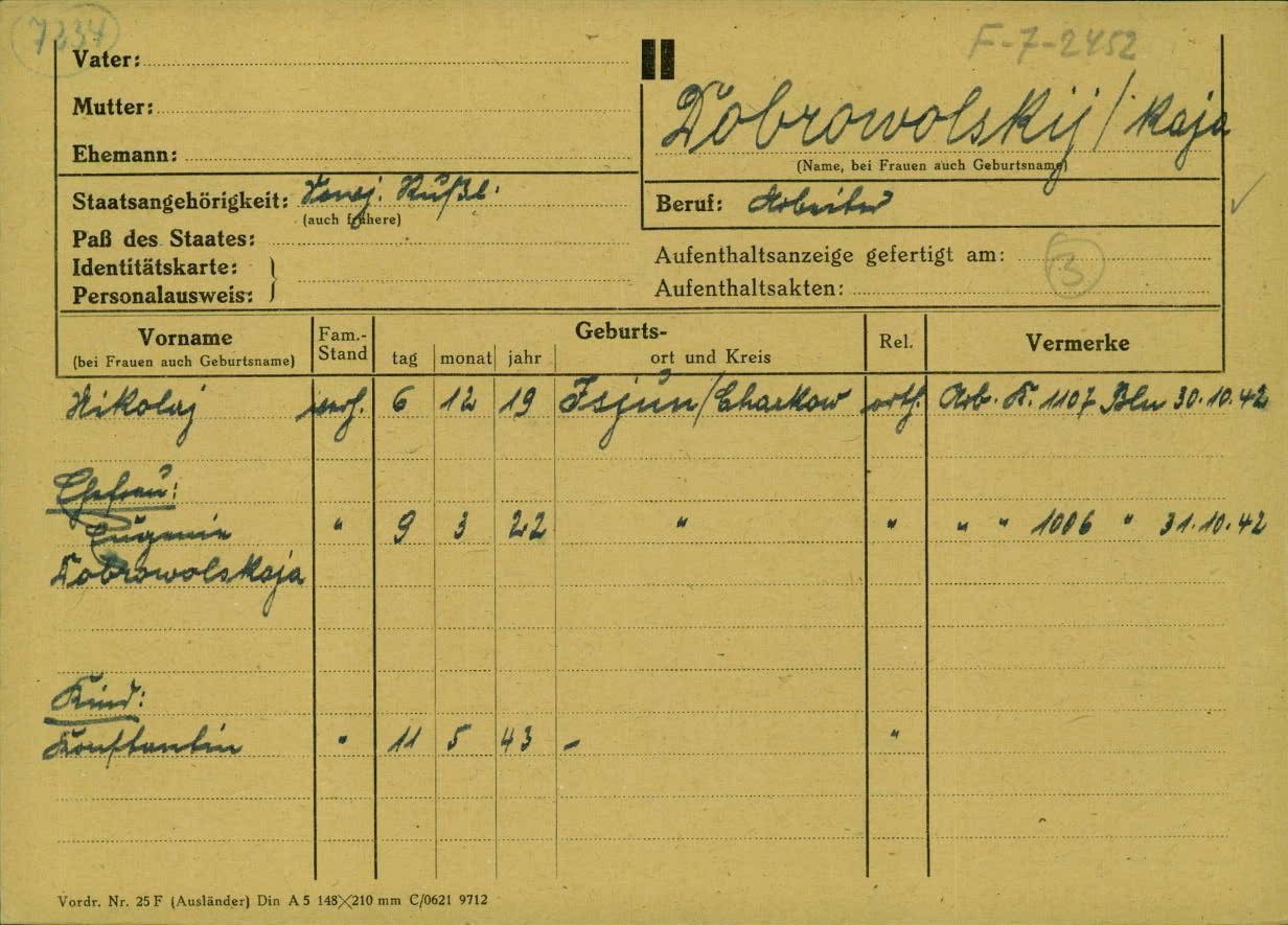 “Подружжя Миколи та Євгенії Добровольських з Ізюма на Харківщині працювали на залізниці в Берліні щонайменше з жовтня 1942 року. Жили разом з іншими примусовими робітниками та робітницями в общинному таборі Kölnnische Heide. 11 травня 1943 року в них народився син Костянтин”, – написав Андрій Усач.