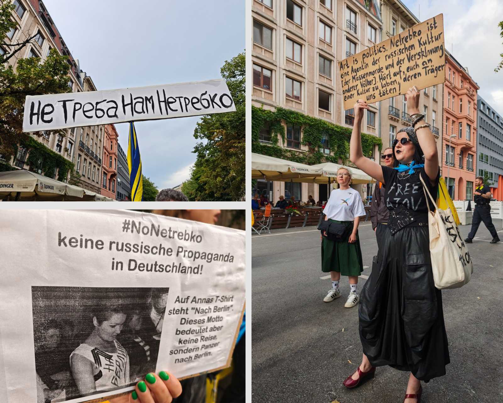 Нетребко – часта гостя у Берліні. Її регулярно запрошує Державна опера, і так само регулярно українці встають з гучними пікетами на Унтер-ден-Лінден. Щоразу, закохана у російське сопрано публіка відкрито демонструє зневагу до протестувальників, кидає презирливі погляди, знімає на телефони, вигукує образи, крутить пальцями біля скроні і показує непристойні жести. Поліція іноді втручається і навіть виписує штрафи. Як і цього разу. На одному з пропускних пунктів одного з двох молодиків, який показував середній палець, відвели у бік і змусили дістати документи та повідомити адресу.