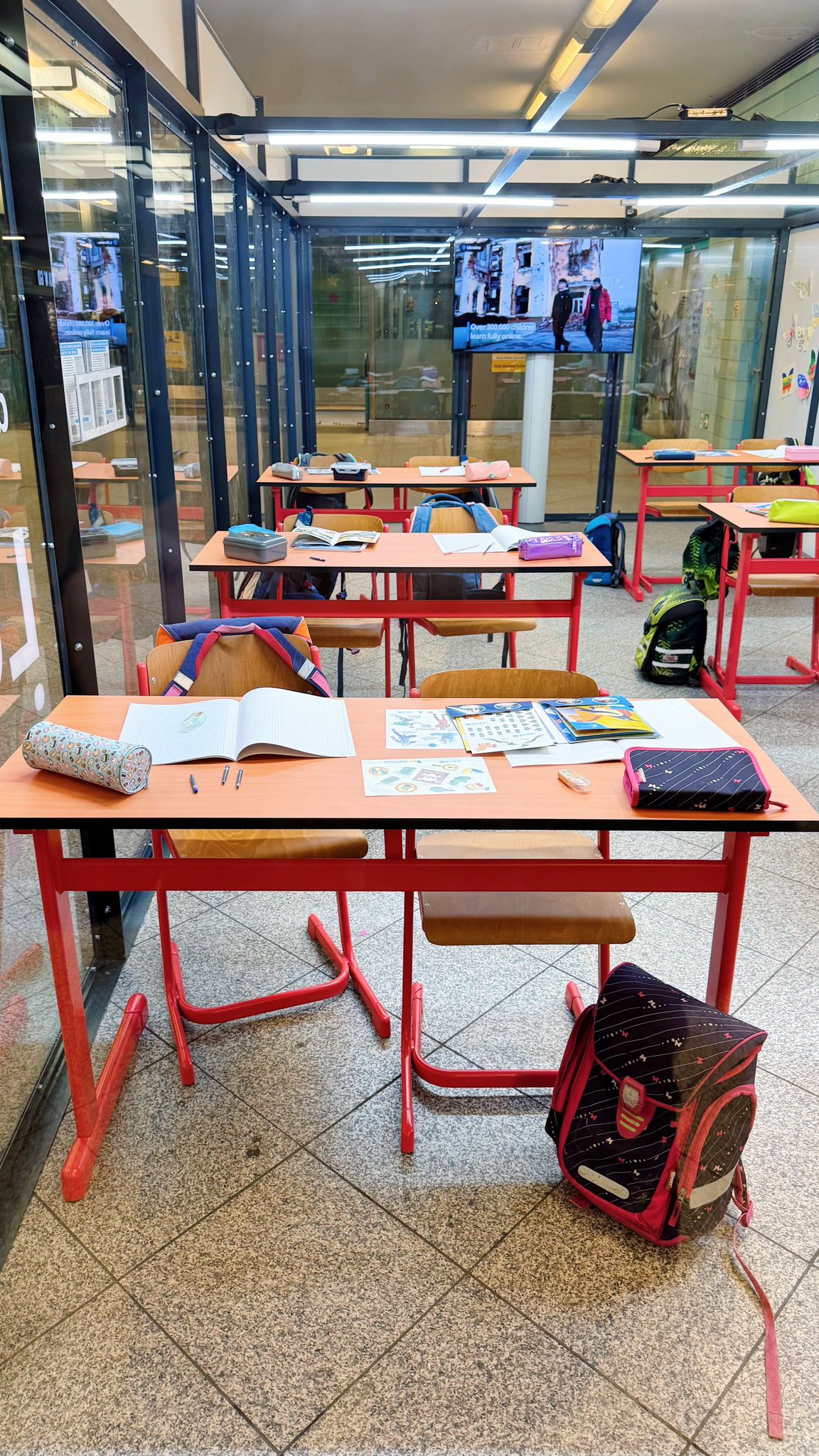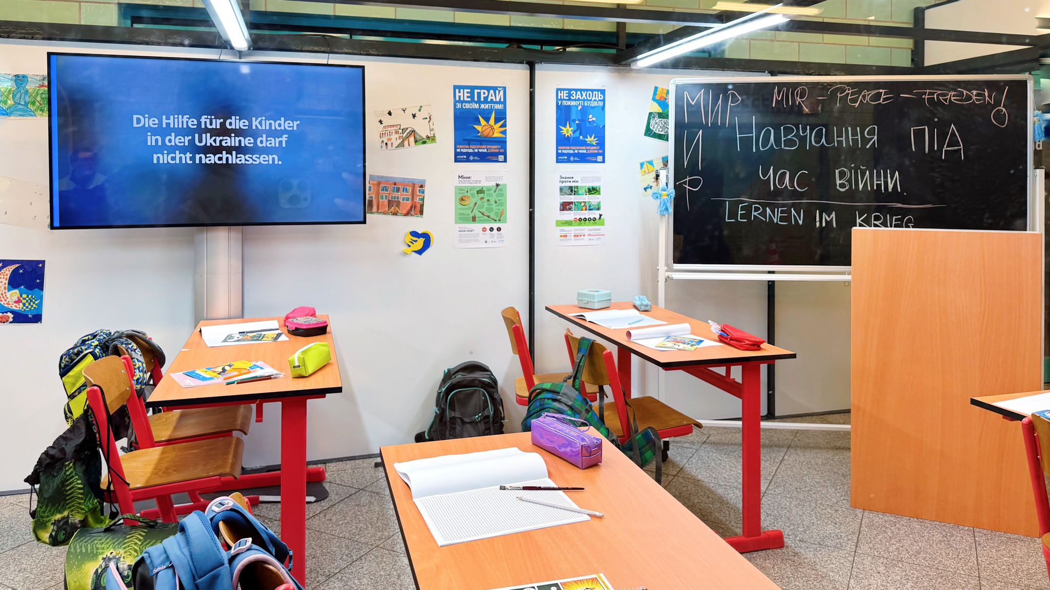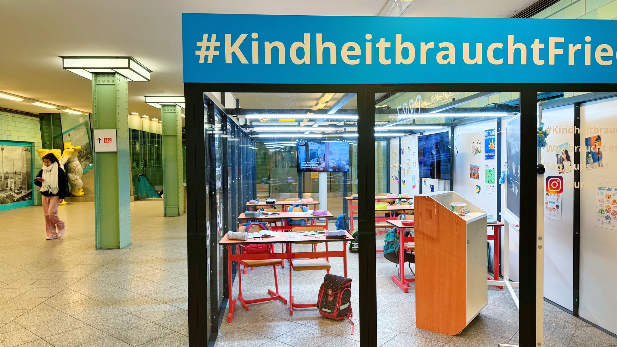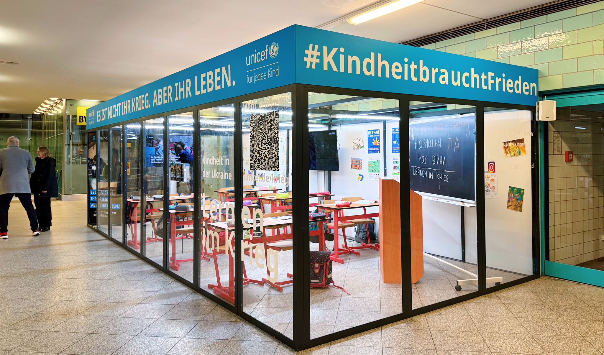 Фонд UNICEF спільно з берлінською транспортною компанією BVG облаштували тимчасову “школу” на станції метро “Александерплац”. Підземний клас з реальними підручниками, партами, рюкзаками та плакатами звели на проміжному рівні між лініями U2 та U8. Інсталяція покликана наочно показати німецькому суспільству, в яких умовах сьогодні змушені навчатися мільйони українських дітей.