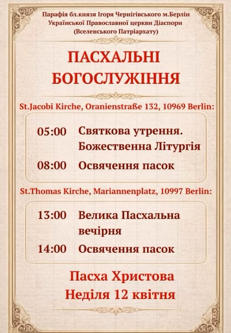 12 квітня у двох церквах паству благословлятимуть священники Української Православної Церкви діаспори ПЦУ (Вселенського Патріархату) парафії святого благословенного князя Ігоря Чернігівського у Берліні. Громада належить до перебуває в єдності з Православною Церквою України (ПЦУ).