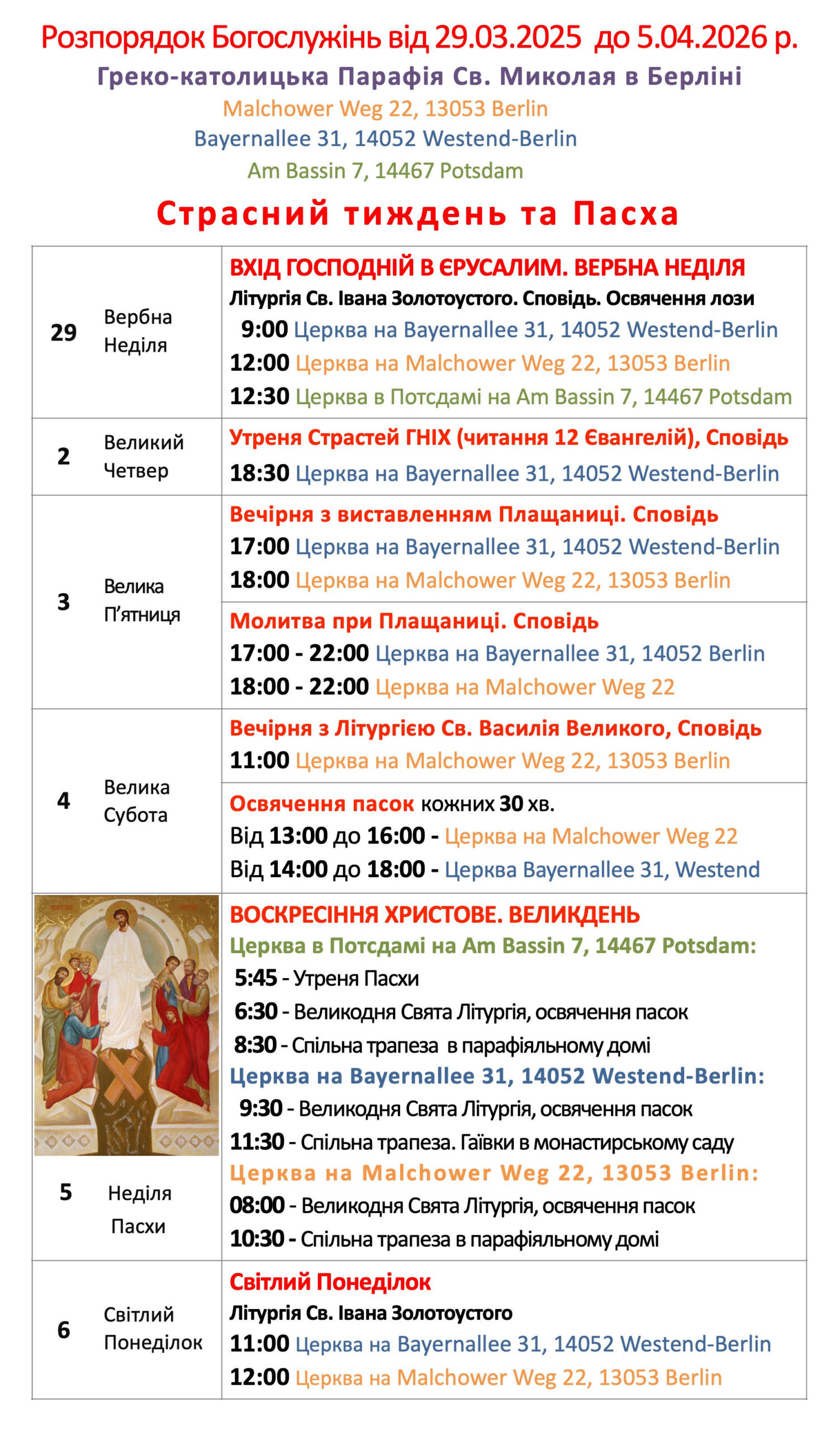 Греко-католицька церква – Українська греко-католицька парафія Св. Микола – запрошує вірян до двох церков у Берліні: Церкви Воздвиження Чесного Хреста, і Церкви Благовіщення Пресвятої Богородиці. А у Потсдамі службі відбудуться у Храмі Святого Апостола Петра.