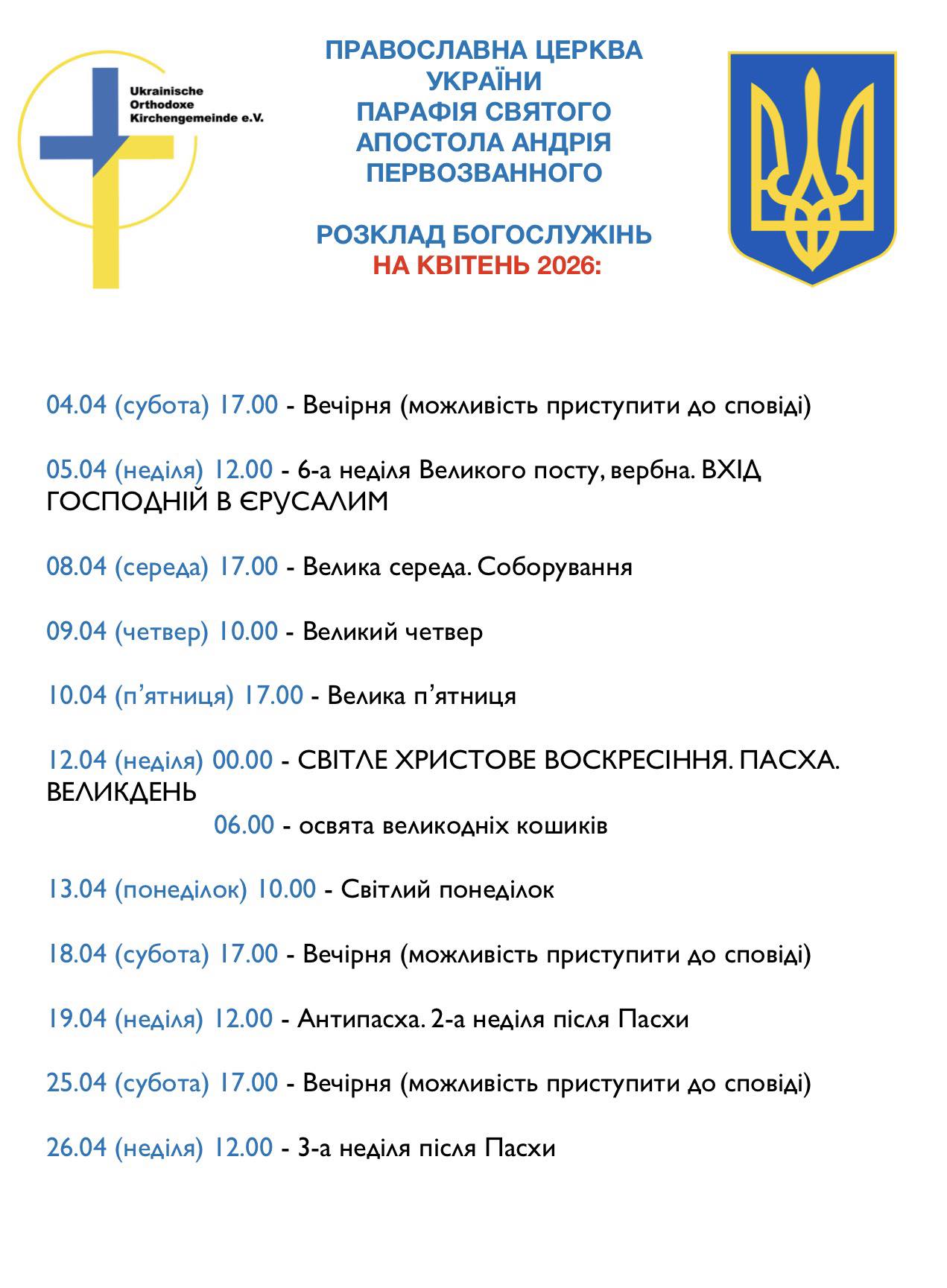 У квітні 2026 року у Берліні українці святкуватимуть Великдень і відвідають служби рідною мовою щонайменше у шести церквах. Християни західного, латинського, обряду святкують Світле Христове Воскресіння 5 квітня, а християни східного обряду, православні – 12 квітня.
