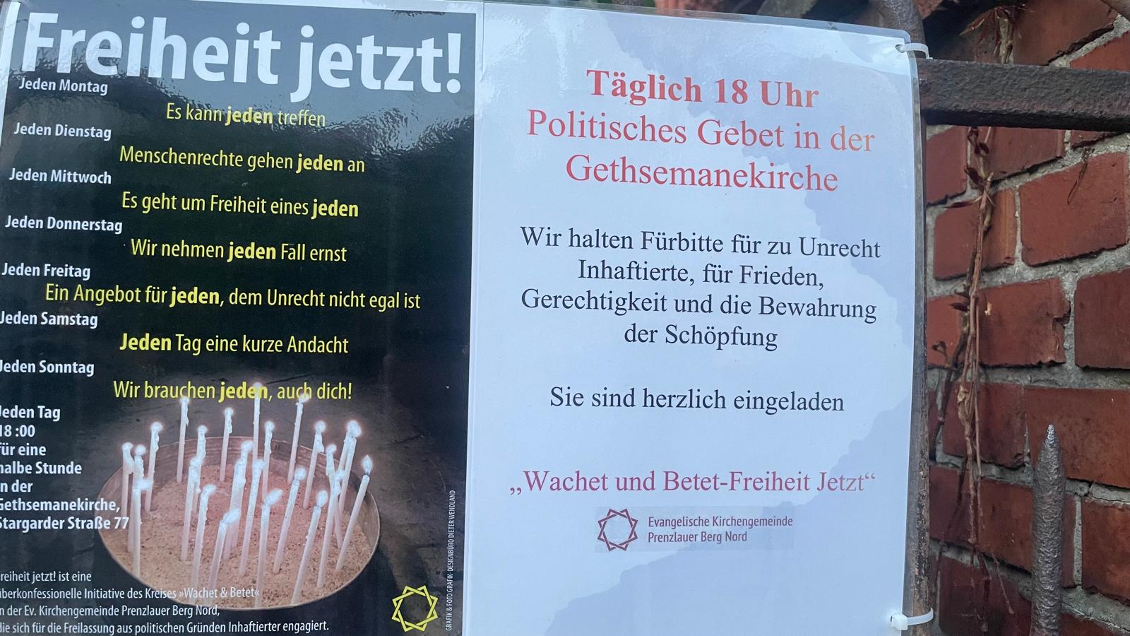 Політичні молитви в Gethsemanekirche тривають близько півгодини і відкриті для всіх – незалежно від віри чи її відсутності. У центрі – історії людей, які зазнають переслідувань і борються за свободу. Наприкінці кожної зустрічі присутні запалюють свічки та спільно моляться.